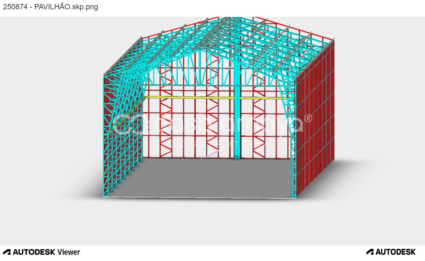 A estrutura compreende radier com 100m², piso polido, calhas, cumeeira e telha sanduiche natural e vão livre horizontal de 6 metros.